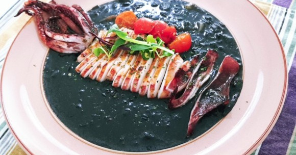 쌀 350ml, 오징어 3개, 양파 1개, 버터 2큰술, 올리브 오일, 갈은 그라나파다노 치즈 5큰술, 오징어 먹물 2작은술, 화이트 와인 60ml, 물 1L, 치킨 스톡 1큰술, 소금. 후추 약간, 다진 마늘 1큰술, 다진 페페론치노 0.5작은술, 오징어 양념 – 파프리카 가루 1큰술, 소금 0.5작은술 – 계량스푼 –