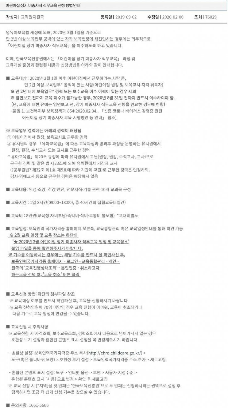 장기 비정규직 연수 신청하시는 선생님들 ㅎㅎ 제가 연수를 진행하는 건 아니지만 도움이 되셨으면 해서 블로그에 올렸습니다!!!!! 읽지도 않았네요 ㅎㅎ… m.blog.naver.com 안녕하세요 벌써 11월이 다가왔습니다. 오늘은 #장기보육교사 및 비정규직을 위한 교육에 대해 알아보겠습니다. 어린이집에서 도와달라고 해서 취직하려고 했을 때 시간제 담임교사로 일을 하고 있었는데 #장기 는 정규교사였어요. 훈련받지 않은 사자는 훈련을 받아야 한다고 합니다. 올해부터 법이 바뀌었다고 하네요! 보육교사 국가자격증 고시 위 사진 참조 (어린이집 근무 공백기간 2년 동안 다른 보육업무를 하신 경우에는 응시하지 않으셔도 됩니다.) 하지만 이런 소리는 어디서나 들을 수 있는 것이 아니고, 11월 현재 대구에서는 더 이상 훈련이 없습니다;; 우선 #보육사 국가자격 사이트 에서 신청하시면 됩니다. 통합교육관리 – 개인별로 확인하실 수 있습니다. 현재 #한국보육진흥원 을 비롯해 올해 들을 수 있는 강의가 없는 것 같습니다. 그리고 차선책으로 #서울보육포털 #서울특별시 보육교사 보수연수 로 접속하세요. – 보수신청서 확인 후 온라인으로 신청하실 수 있습니다. #장기비정규직훈련 선택 후, 날짜에 맞는 교육을 신청해서 들어보세요! 코로나로 인해 온라인 교육이 많아지고 있습니다. 저도 급하게 신청했는데 이제 신청이 완료되었습니다! 나중에 결과를 기다려야 할 것 같아요. 임면신고를 받기 전 교육을 이수해야 하므로 2021년 취업을 계획하고 계신 분들은 미리 교육을 받아보시는 것도 좋을 것 같아요!! 모두 행운을 빌어 요!! 그리고 감기 조심하세요^^ 추가글: 대구에는 수업이 없습니다. 강의 #한국방송사이버대학교에 수업을 신청했는데 나중에 수업료 안내와 카페 주소가 포함된 문자가 왔어요. 회원가입 후 개인정보 동의 포함 3가지 서류를 제출하였습니다. 기본 수업료는 80,000원이며 어디든 동일한 것으로 알고 있습니다. 자세한 내용은 당사에 문의하시기 바랍니다. 재학중인 학교에 문의하시면 됩니다. 시험이 없습니다. 40시간 완료. 주간수업, 야간수업 1주일. 이주. 50분 수업. 10분 휴식 또는 교수 재량에 따라 결정됩니다. 1회 결석시 수료가 불가능합니다. 3명이 늦게 도착했습니다. 결석 1건이 처리되었습니다. 중도 퇴실 시 수수료 일부 환불 강좌를 마친 후 등기우편으로 수료증을 보내드립니다. 그룹 교육이므로 수업 중 영상채팅 녹화 화면에 얼굴이 나와 있어야 합니다. 또한 수료 후 2년 이내에 취업을 해야 하며, 2년 후에는 다시 수료해야 합니다. #비사원 장기교육이 유효합니다. 기간