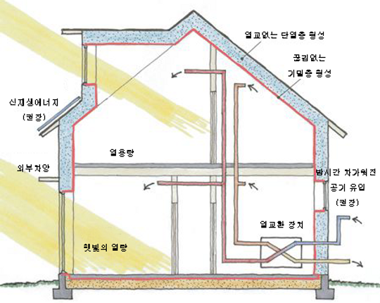 이러한 건축 방식은 기본적으로 독일에서 유래되었으며, 외부 온도 변화에 영향을 덜 받아 에너지 효율을 높이는 것이 목적이다. 따라서 단열, 환기, 열회수, 창호 등에 많은 신경을 써서 건축한 특징이 있습니다.