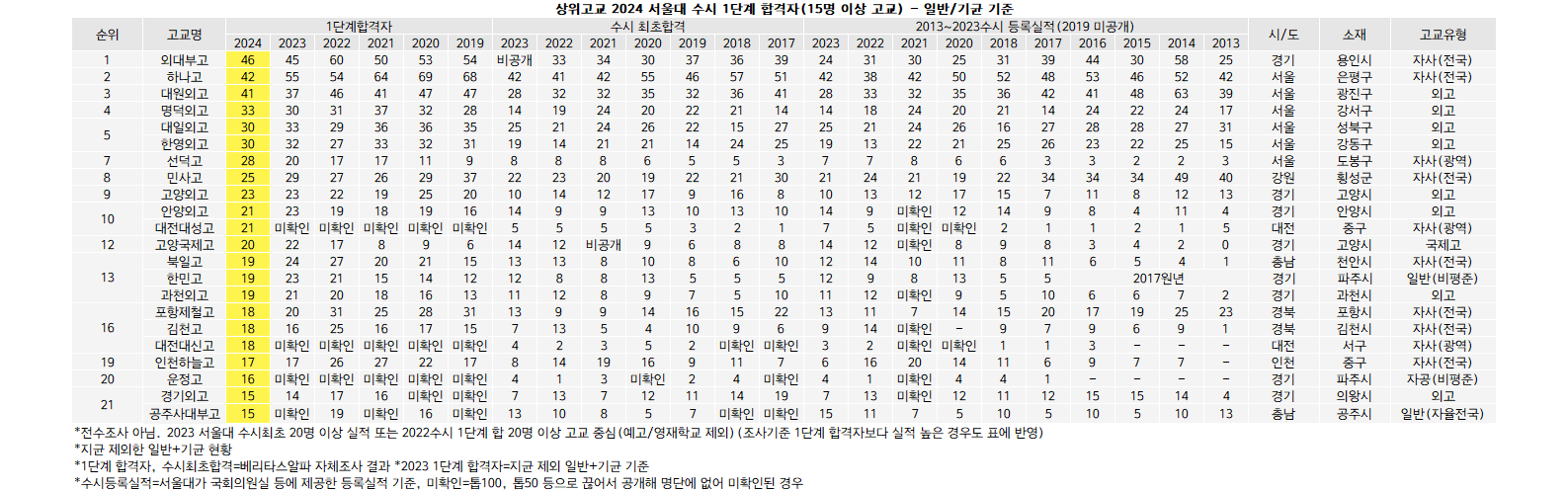 2024년 고등학교 선발) 서울대학교 입학성적, 의과대학 합격성적 (출처=베리타스알파) 고등학교 입학이 대학 입학에 좌우되는 종속변수인 점을 고려하면, 의과대학 성적은 대학 진학에 가장 중요한 기준이 될 것으로 예상된다. 올해 고등학교 입학을 선택하세요. . 서울대학교로 대표되는 ‘학문시대’에 서울대학교 입학 성적이 각 고등학교 수시전형을 측정하는 기준이었다면, 의과대학 입시 성적은 판단의 기준이 된다고 할 수 있다. 과학 위주의 정규입시 시장에서 어느 고등학교가 강세인지 미리 알아보세요. . 지난해 치러진 2023학년도 수시 의과대학 수시에서 강한 성적을 보인 고등학교는 휘문고, 상산고, 외국고, 중동 등 서울 특수교육구역에 위치한 시립·국립사립고였다. 고등학교, 현대청운고등학교. 경신고(대구), 대련고, 단국고, 강서고 등 특수교육구역 내 일반고들도 뛰어난 의과대학 성적을 기록하고 있어 주목할 필요가 있다. 안정적인 수시모집 시스템도 고려해야 할 조건이다. 수시 이월을 포함하면 절반에 가까운 40%의 정규전형 비율이더라도, 정규전형의 비율이 60%에서 시작된다는 사실을 무시할 수 없습니다. 더욱이 2028년 대학입시 개편안의 영향으로 정규전형에 질적 평가를 반영하려는 움직임이 커지고 있는 점도 수시모집의 중요성을 더욱 높여준다. 물론 2028년 대학입시 개편안의 직접적인 대상은 아니지만 대학들이 이미 선제적 대응을 준비하고 있는 만큼 2027년 대학입시 역시 2028년 대학입시 개편안의 영향을 받게 될 것으로 전문가들은 분석한다. 특히, 의과대학의 증가에 따라 크게 증가할 것으로 예상되는 N명의 학생수가 정규전형을 목표로 하고 있다는 점을 염두에 두고, 수시전형은 재학생들에게 대학입학의 절대적인 관문이 될 것입니다. 수시전형에서는 특목고와 사립고로 진학하는 것이 가장 유리하다. 경쟁적인 학사제도를 갖춘 특수지원학교는 일반고에 비해 더욱 정교한 입시 전략을 갖고 있어 다른 유형의 고교보다 뛰어난 입시 성적을 기록하고 있기 때문이다.